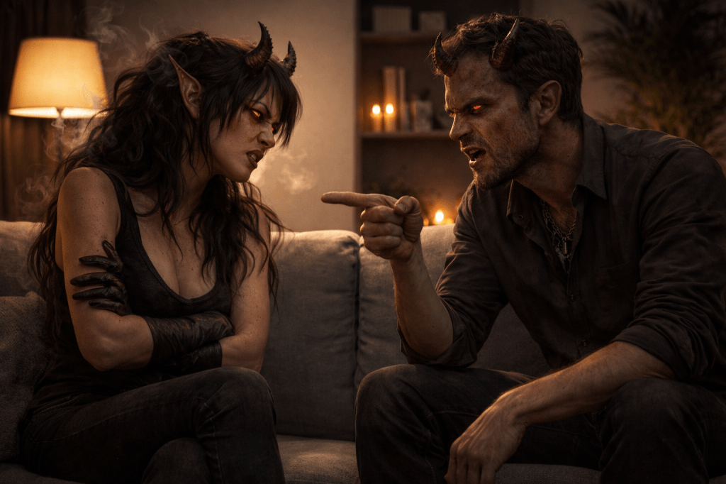 De ovnsbakte grønnsakene har rukket å bli kalde. Rødvinsflaske nummer to er åpnet – og stearinlysene blafrer håpefulle i vinden. Skulle ikke dette egentlig bli en romantisk kveld? Minstemann er stasjonert hos bestemor, og sover sikkert søtt i sengen sin – stappfull av sukker og kjærlighet – hele to mil unna. Men hva bruker mamma og pappa sin etterlengtede frikveld på? Jo, de sitter og glefser til hverandre med rødvinstenner og norgesmesterskapet i drittkasting har for lengst gått av stabelen. Det som startet med en litt klønete kommentar, har utviklet seg til en demonisk dialog. (Et begrep hentet fra parterapeut Sue Johnson og arbeidet hennes med emosjonsfokusert terapi.)